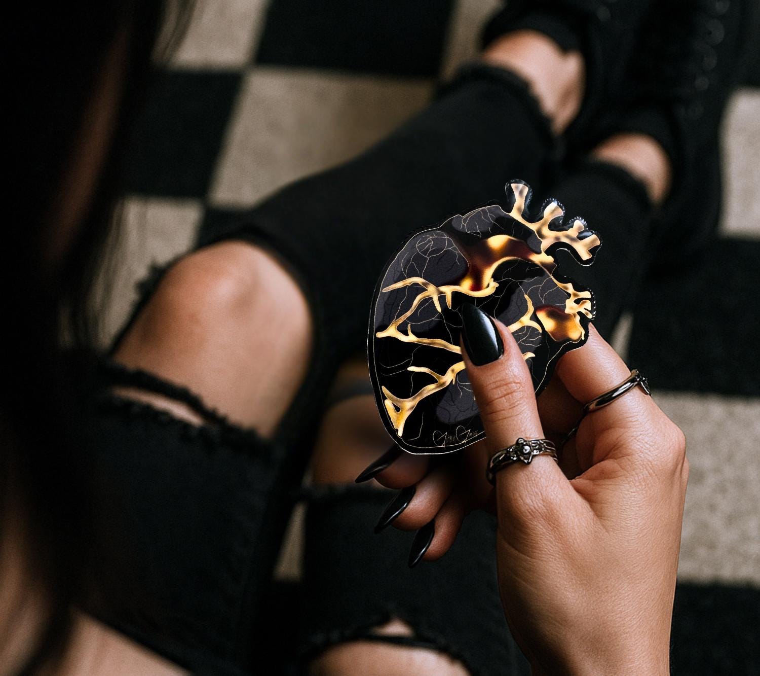 This hand-drawn gold and black anatomical heart sticker blends medical illustration with gothic elegance. Designed in an x-ray style with glowing gold vein details, it’s perfect for anyone who loves anatomy-inspired art, dark romance, or striking conversation pieces.