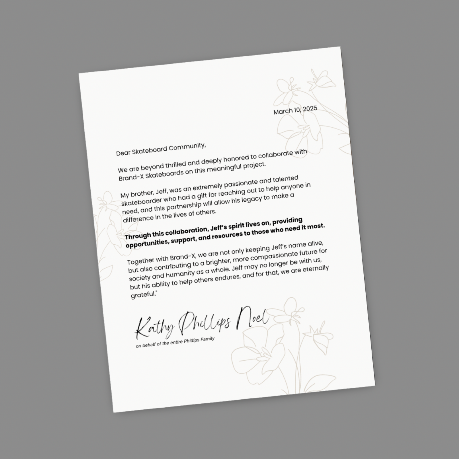 Proceeds from this product are being donated to non-profit organizations that empower youth through sports, which were hand selected by Jeff’s family.. READ THE LETTER FROM JEFF'S SISTER Kathy, in the pictures.