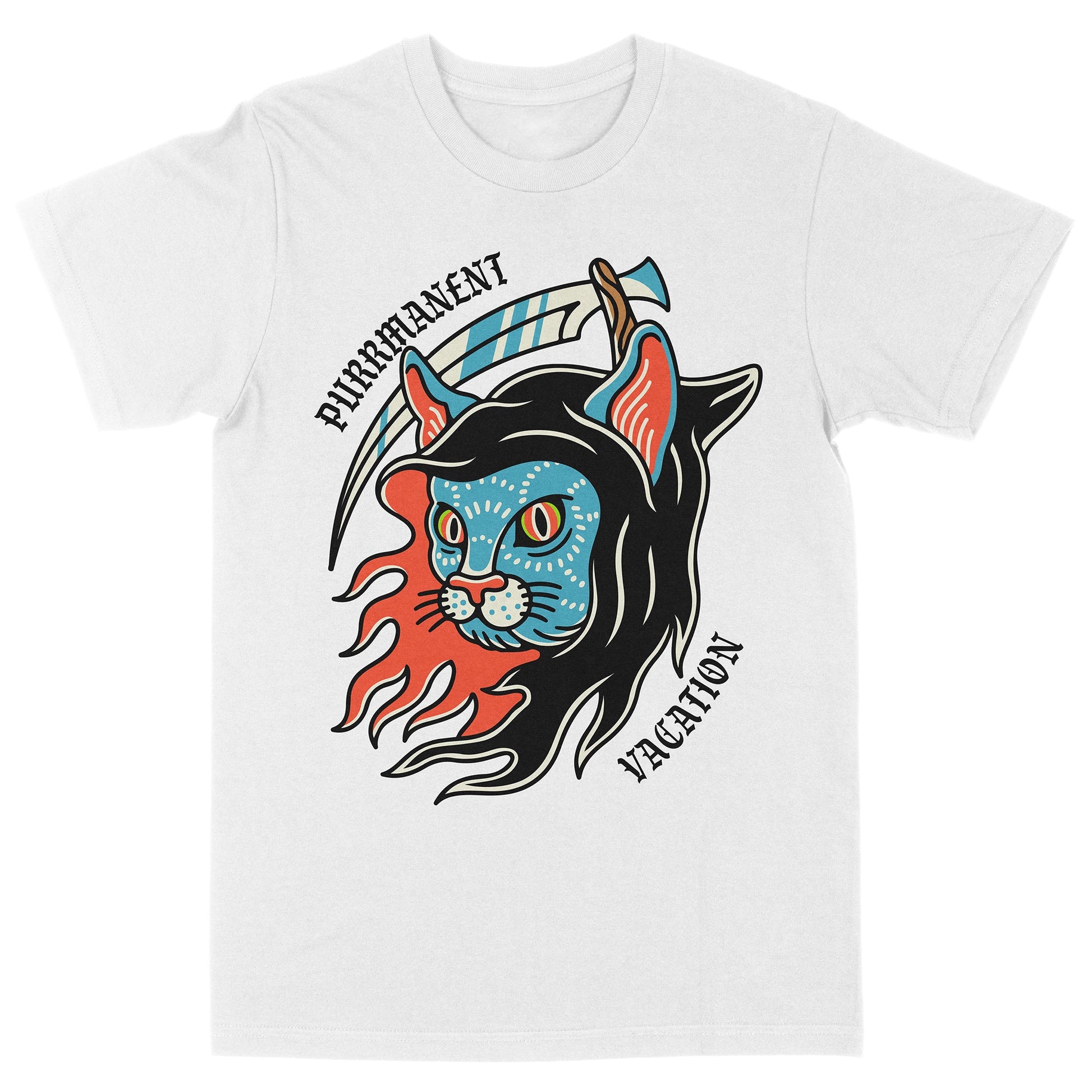This traditional tattoo-inspired design features a grim reaper cat t-shirt with the words Purr-manent Vacation written on the shirt. This tattoo t-shirt is printed on super soft black and white unisex t-shirts.