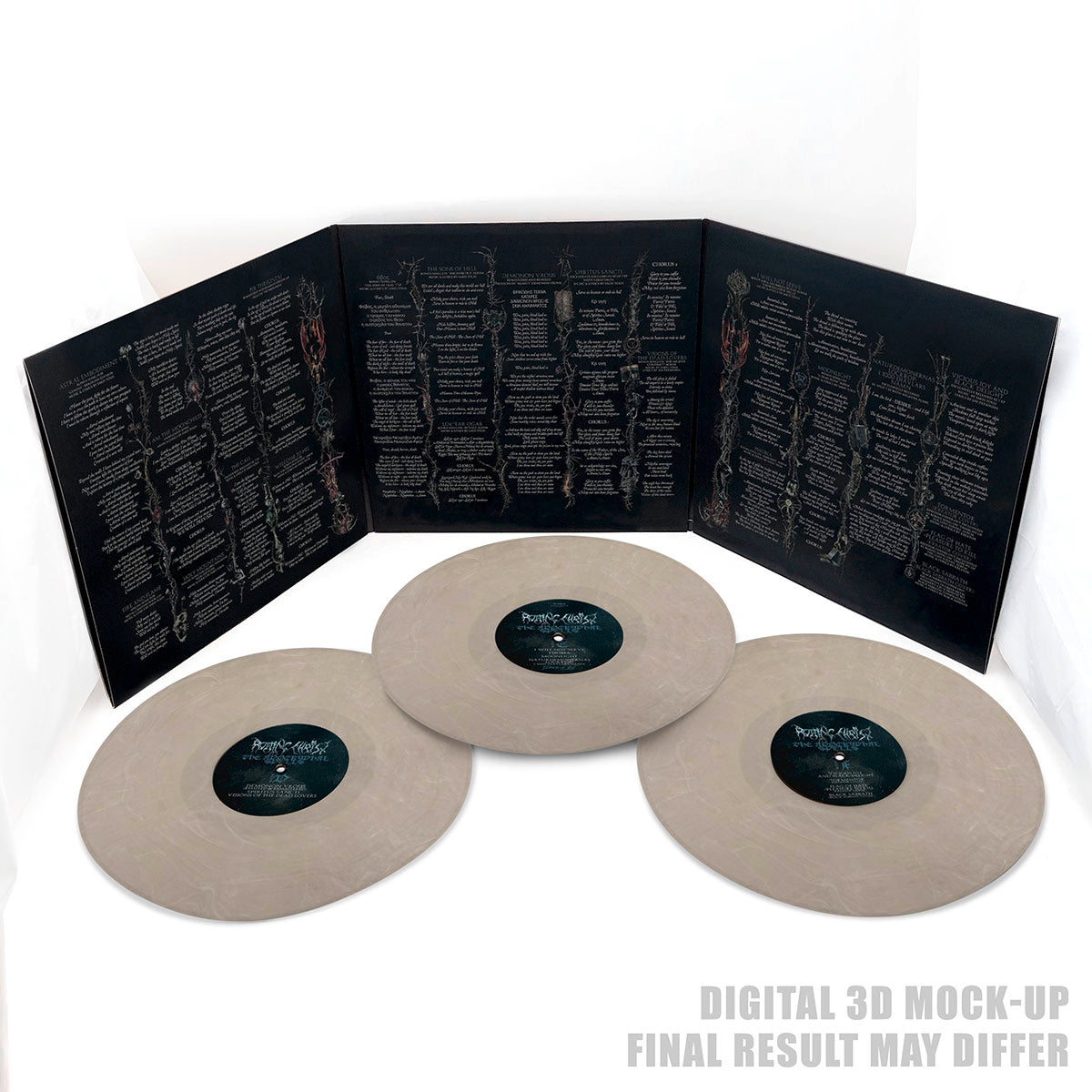 Black 12" triple vinyl (33 rpm) in triple gatefold.