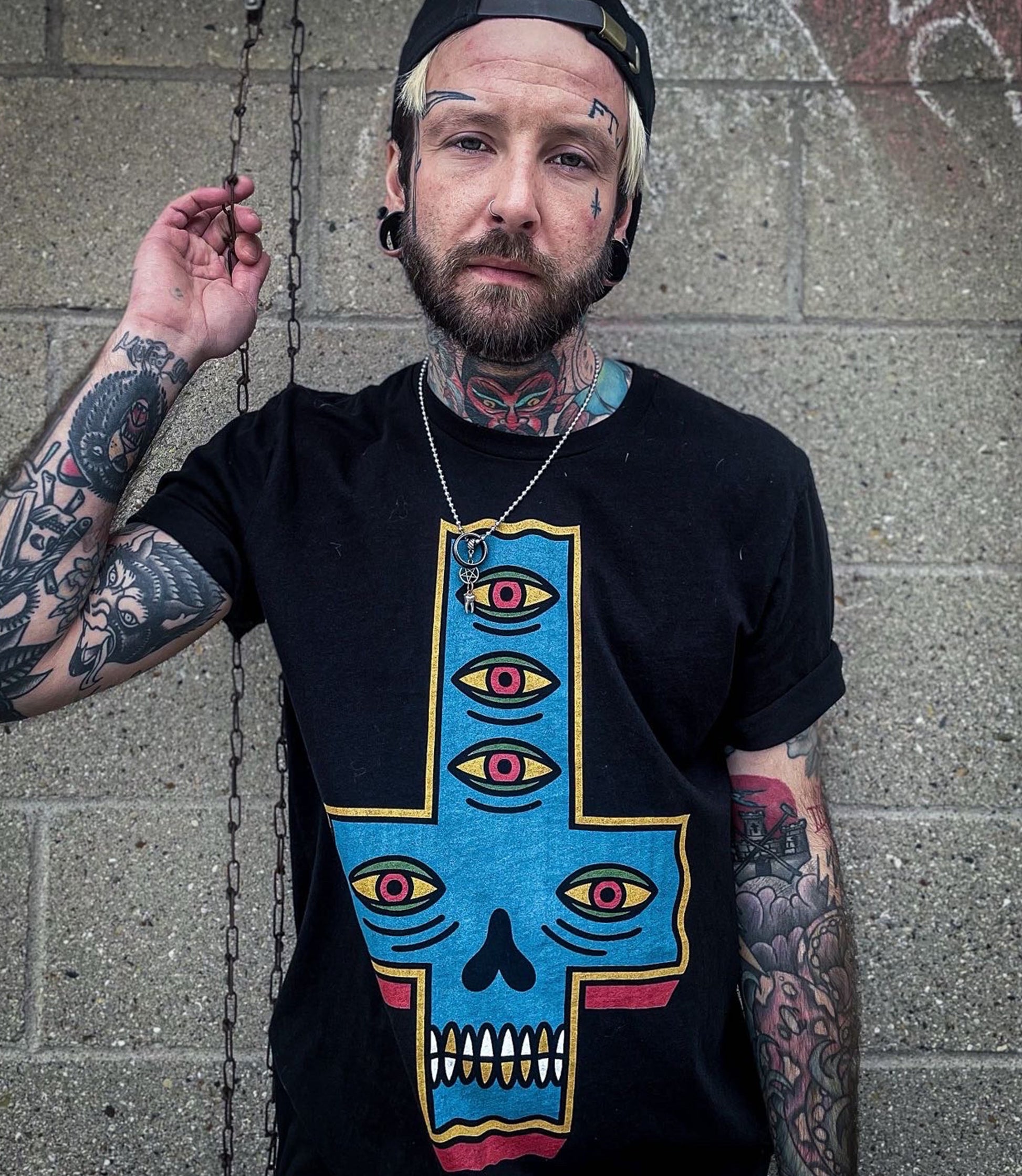 Pay homage to the legendary tattoo artist Dan Higgs with the Skull Cross T-Shirt. This design features a haunting inverted cross, its center dominated by a skull face, its gaze intensified by many watchful eyes. Inspired by Higgs's iconic American Traditional tattoo style
