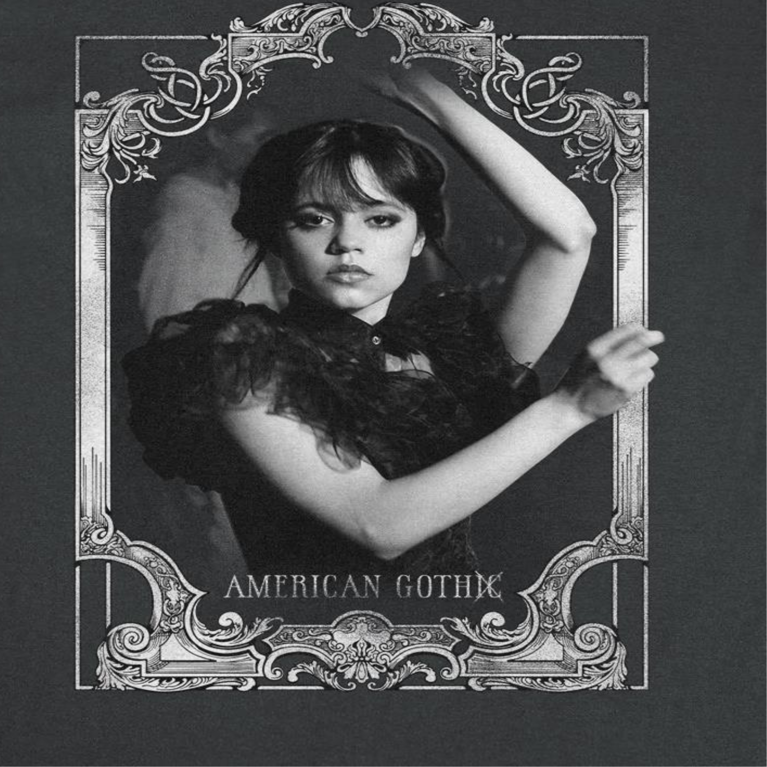 Check out this cool wholesale Wednesday American Gothic Black T-Shirt from the enormously popular Netflix Wednesday series. Each shirt is a black 100% cotton, standard-fit, heavyweight tee. Officially licensed.